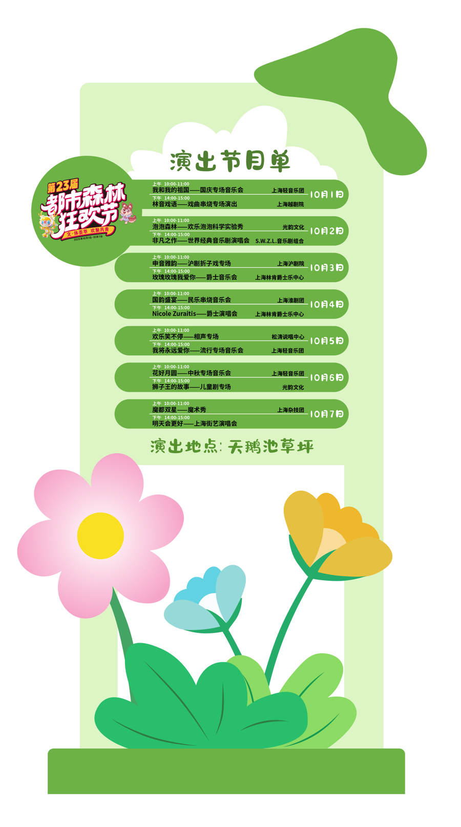 10月1日至10月7日的每天上下午,将推出14场不同风格的演出。包括上海轻音乐团带来的国庆专场音乐会、上海越剧院带来的戏曲串烧、“光韵文化”带来的欢乐泡泡科学实验秀、上海沪剧院的沪剧折子戏专场等。(排片表附后)